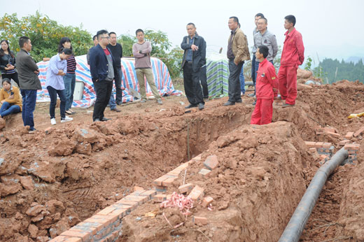 还没到达施工现场,崎岖陡峭的山路就让大家一路跋涉得气喘吁吁、汗流浃背,首先体验感受到了野外施工作业的艰辛。在大石南山山麓高达数百米的半山腰上,大家看到了两处安全隐患施工作业点,挖掘机在现场正紧张地进行施工,所用砖和水泥、砂石等,都已经从山下转运到位,管道已经敷设完毕。公司苟建华、张爱明向参加活动交流体验人员介绍了工程情况、工作人员的工作和生活条件。