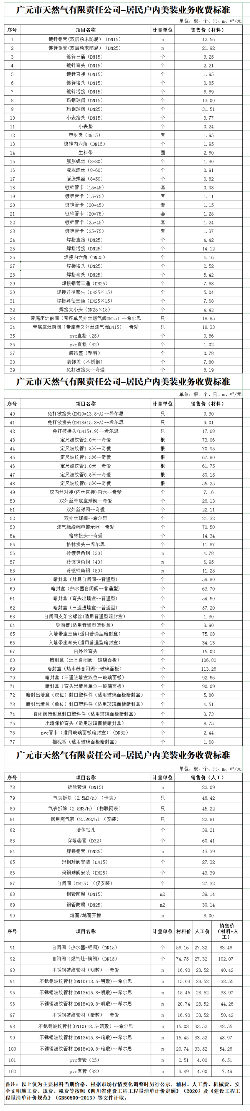 广元市天然气有限责任公司收费标准一览表